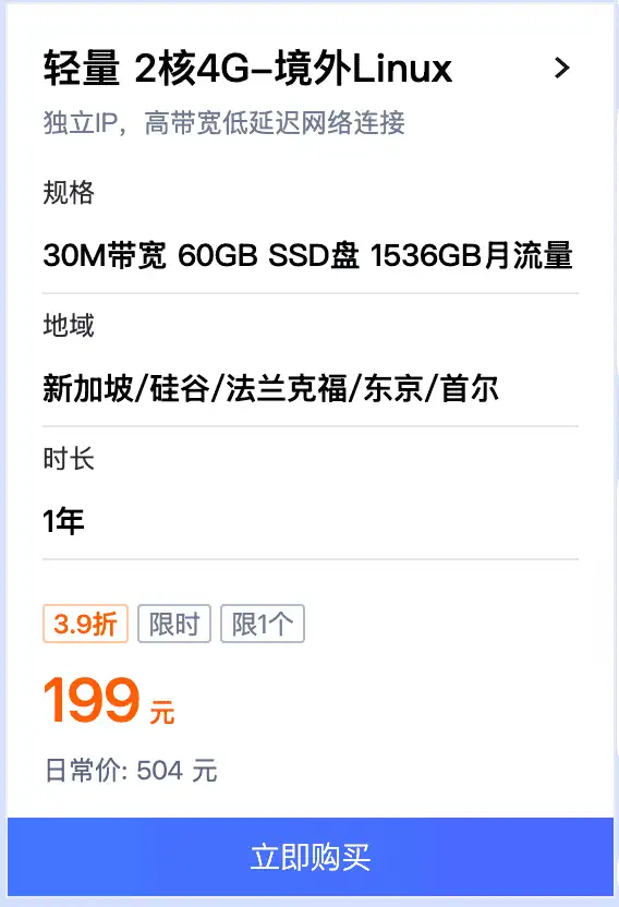 - 如果你需要备案,需要接入国内支付/短信登陆,需要国内访问非常稳定,请购买境内服务器!